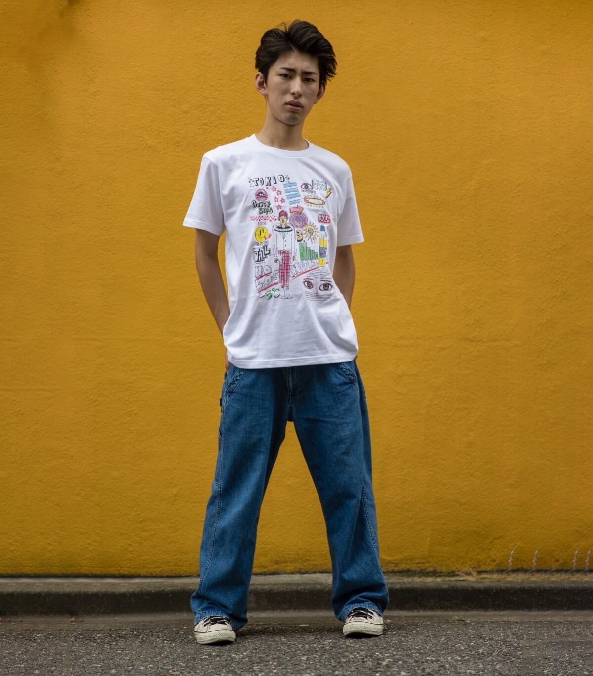 デザイナーDAITOのホワイトカラープリントTシャツ。